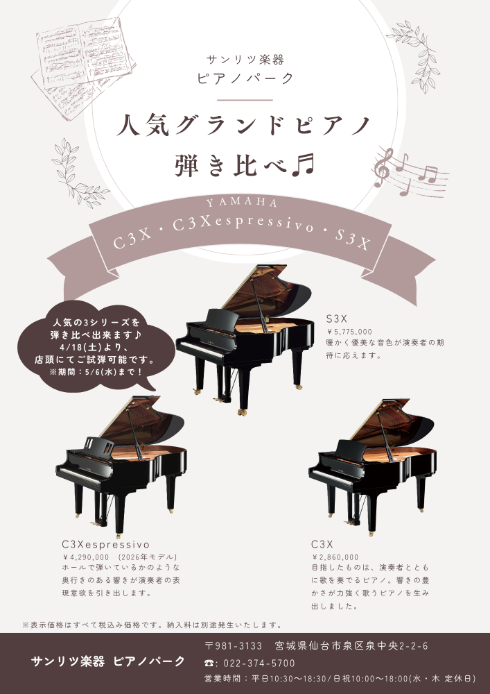 2026.3/7 イベント情報 更新しました♪2026.2/21 新商品 ELS-03シリーズ 商品情報に追加しました♪2026.2/6 イベント情報 更新しました♪2026.1/27 イベント情報 更新しました♪2025.12/8 イベント情報 更新しました♪2025.12/2 中古ピアノ情報 更新しました♪2025.10/18 中古ピアノ情報 更新しました♪